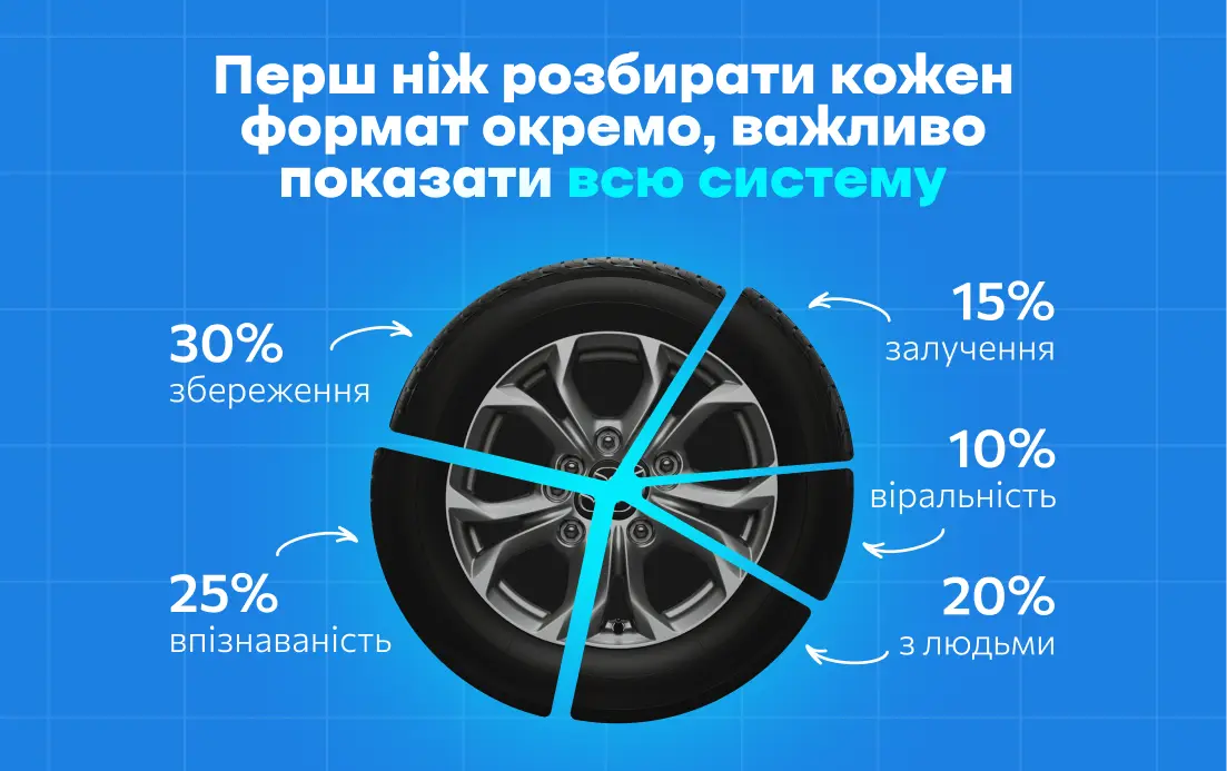 Дисклеймер: колесо-балансу — це наче наповнення контент-плану (тобто 100%). І 1 формат контенту може бути в різних плейсментах (як дописи, так reels чи stories).