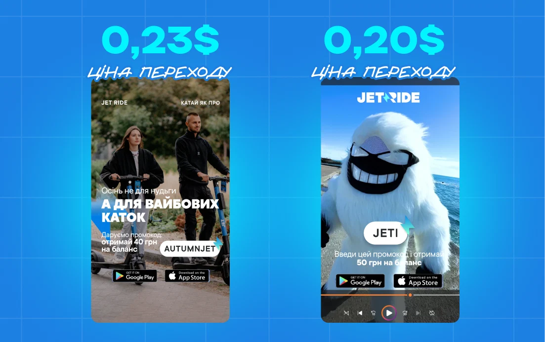 Завдяки тісній співпраці з командою Jet Ride та глибокому розумінню цінностей бренду, ми перетворили звичайні самокати на ефективне джерело нових підписників. Бренд розмістив на самокатах QR-коди, що стало простим способом перевести людей з офлайну до нас у соцмережі.