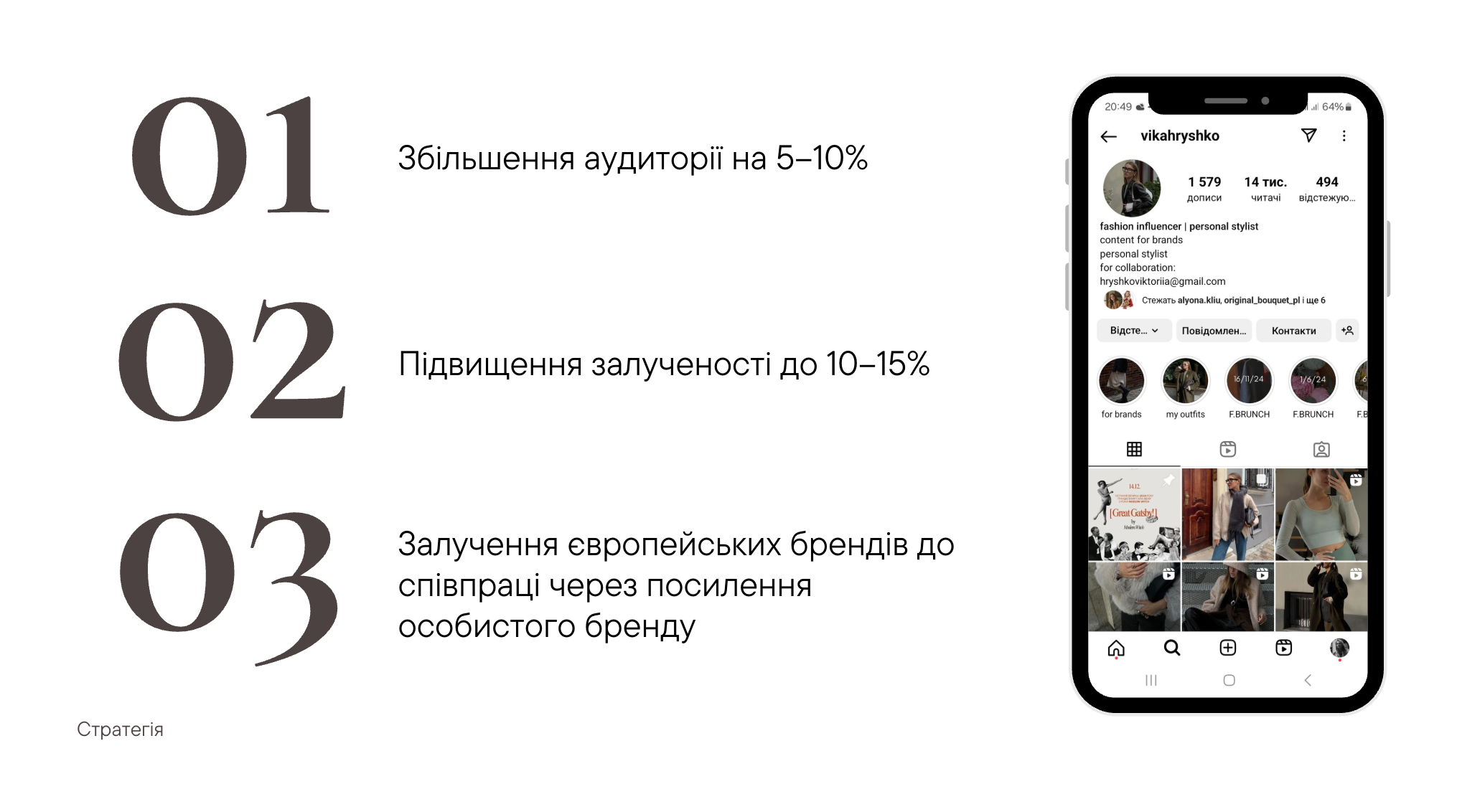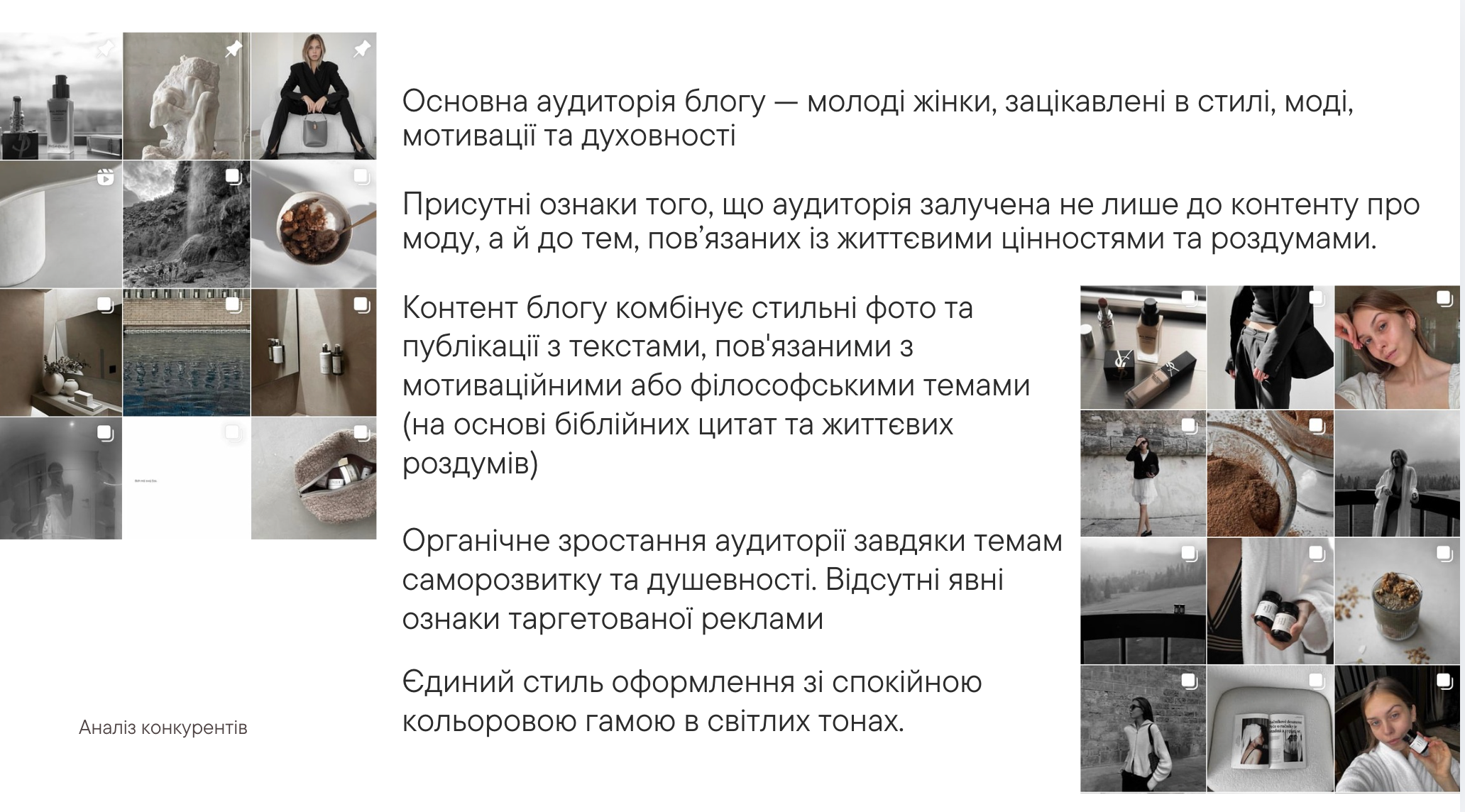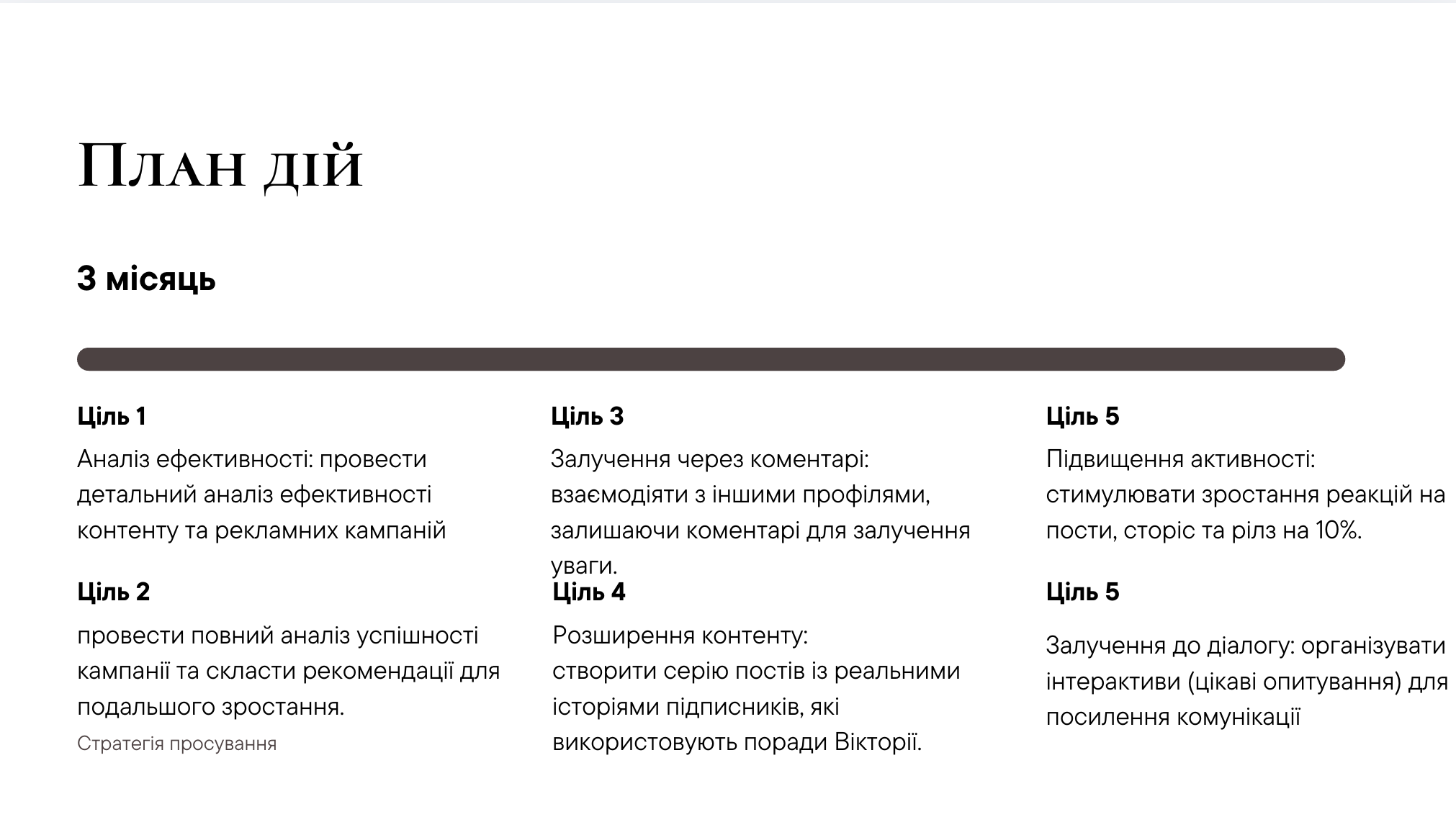 Зараз ти побачиш окремі слайди зі стратегії, яку студентка формувала для клієнта. Це не повний файл, але навіть в такому вигляді ти зможеш оцінити рівень та глибину знань випускника.