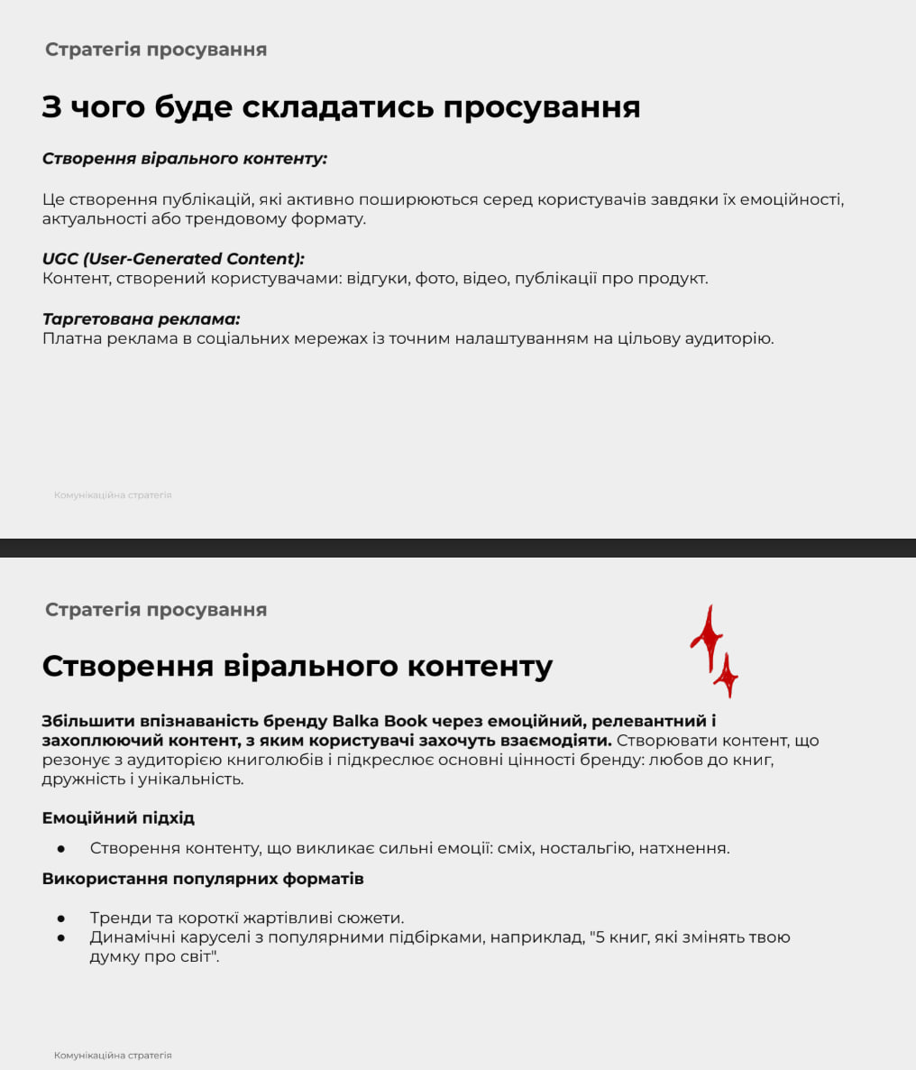Зараз ти побачиш окремі слайди зі стратегії, яку студентка формувала для клієнта. Це не повний файл, але навіть в такому вигляді ти зможеш оцінити рівень та глибину знань випускника.