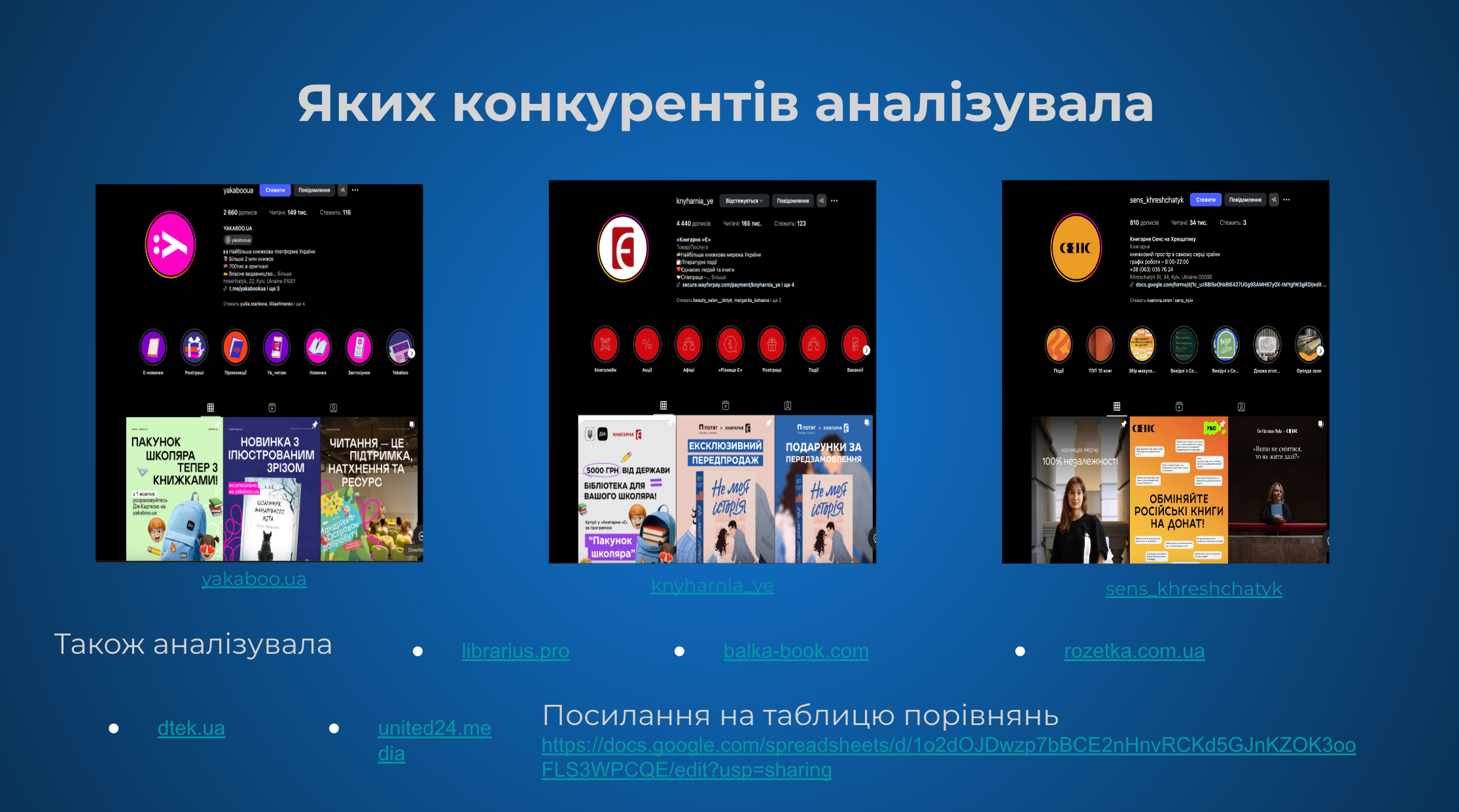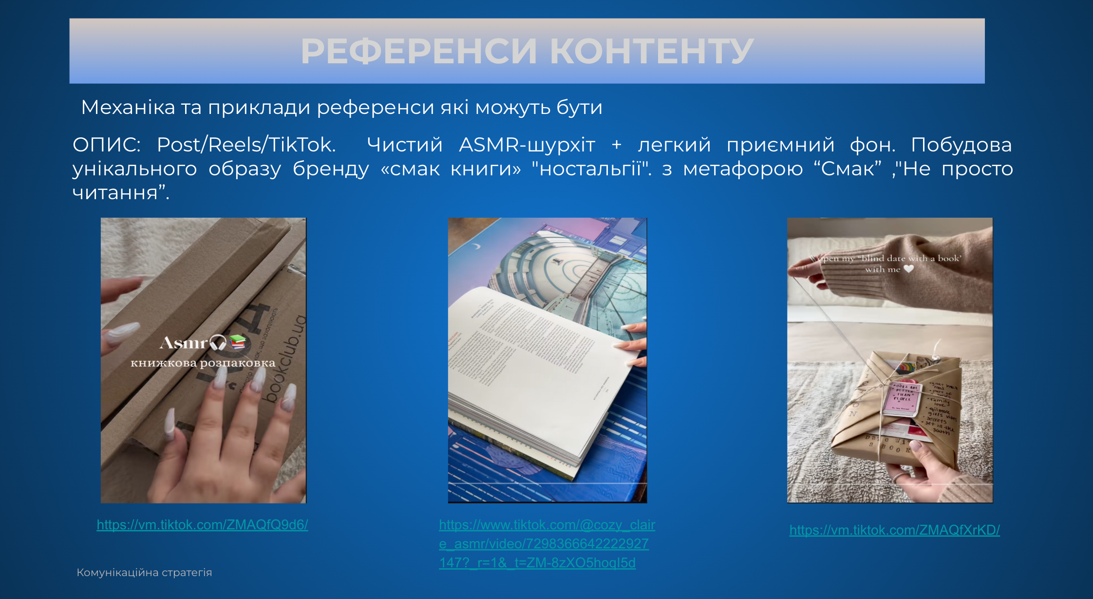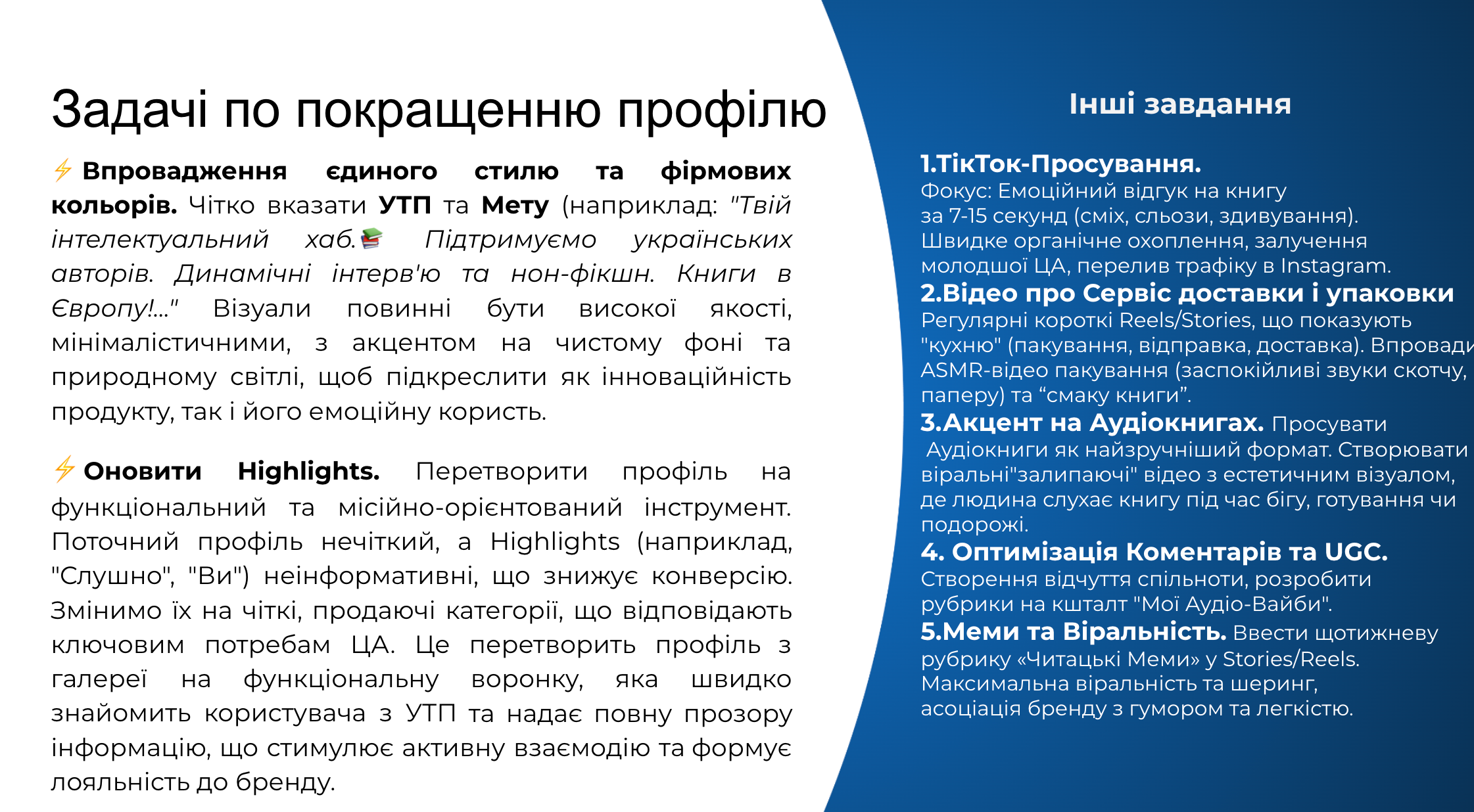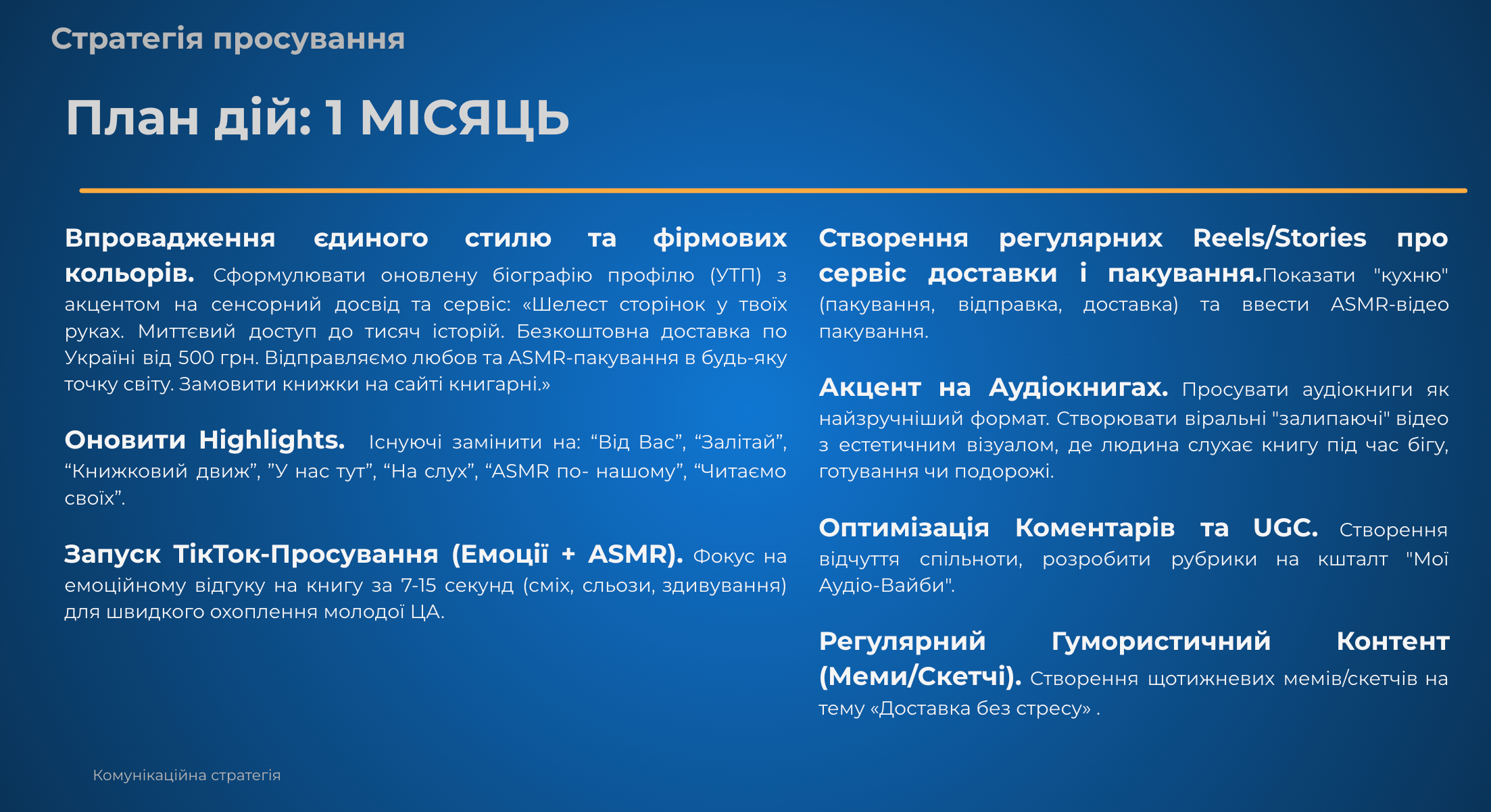 Зараз ти побачиш окремі слайди зі стратегії, яку студентка формувала для клієнта. Це не повний файл, але навіть в такому вигляді ти зможеш оцінити рівень та глибину знань випускника.